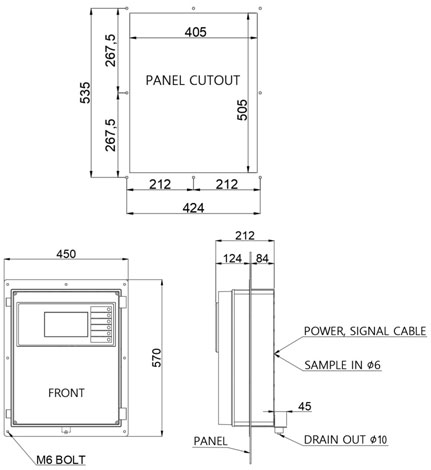 | Data Output | 4∼20 mA 2 ea, Alarm 2 ea, RS 485 Modbus (Option) | |||